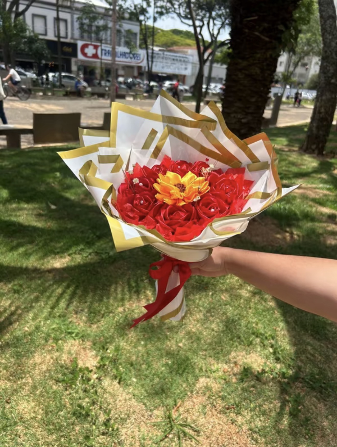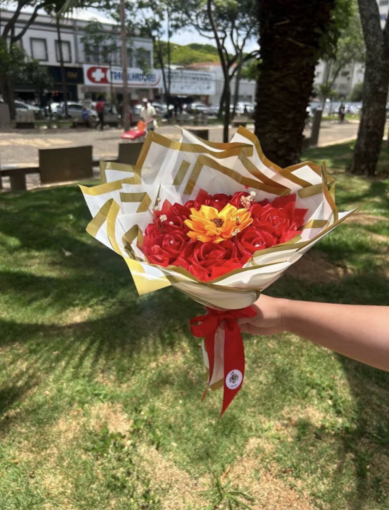 Buque de 8 rosas de cetim com 1 girassol e perolas quantidade