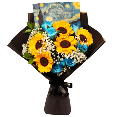 Inspirado na obra Noite estrelada de Van Gogh o Buque de Girassóis, rosas azuis com gypsophila tenta expressar e catalisar essa essência de vitalidade e constância todos em um único buque. Para presentear com classe e estilo, os girassóis junto com a Rosas Azuis representam esse momento de grandiosidade e alegria. Surpreenda!